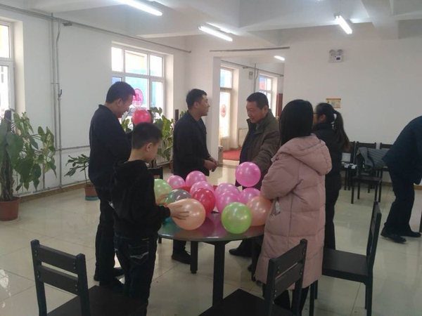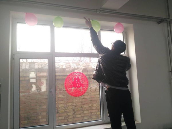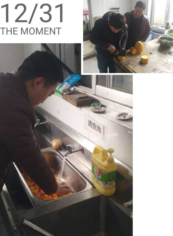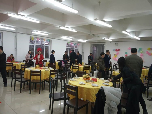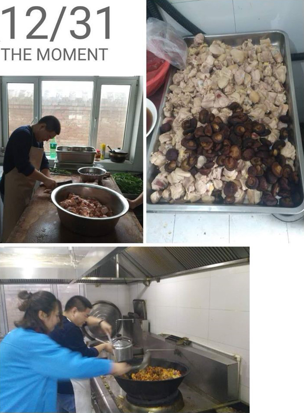 大家伙共同布置我们的会场,贴福字,挂条幅,换桌布,有些同事自己从家里拿案板与厨具。四星也是我们的家。